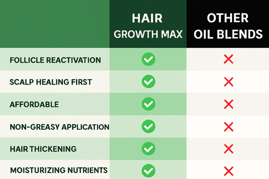 Hair Growth Max targets both the scalp and the hair follicles directly with a nutrient blend that reactivates growth and repairs damage. It’s not just oil — it’s a science-based growth treatment.