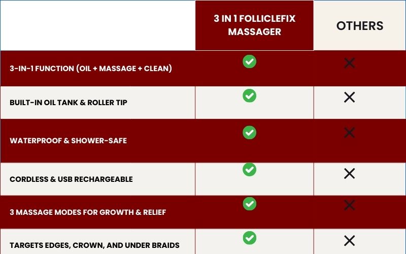 Most tools either just massage or just apply oil. FollicleFix does both—and more. It stimulates your scalp, applies oil directly to thinning areas, improves absorption, and makes your routine mess-free and consistent. It’s the only tool designed to solve the real problems behind slow hair growth.